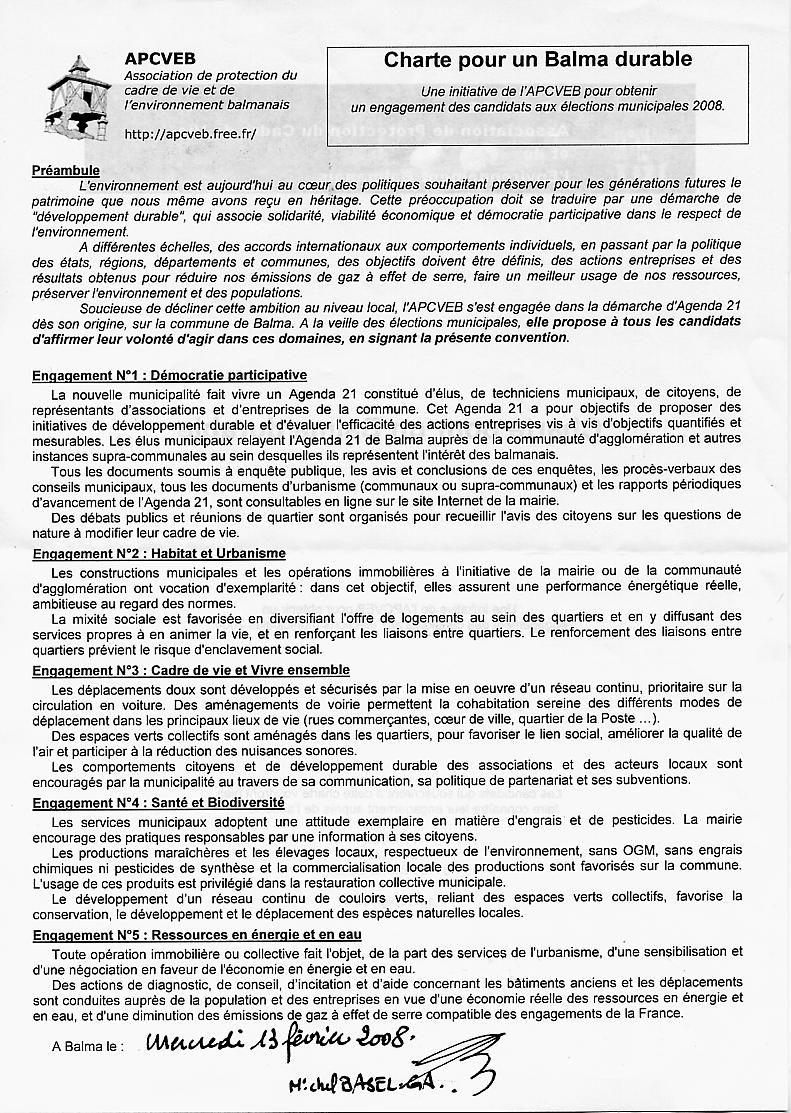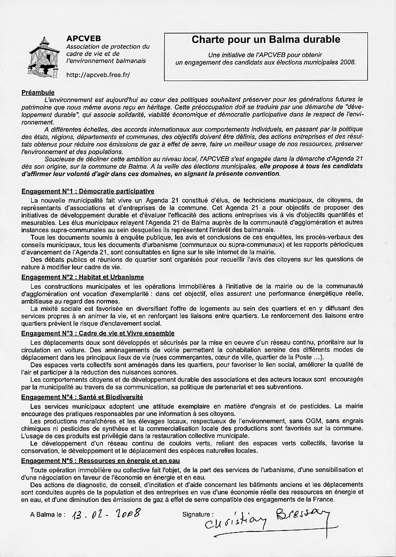 Soucieuse de décliner cette ambition au niveau local, l’APCVEB s’est engagée dans la démarche d’Agenda 21 dès son origine, sur la commune de Balma. A la veille des élections municipales, elle propose à tous les candidats d’affirmer leur volonté d’agir dans ces domaines, en signant la présente charte.