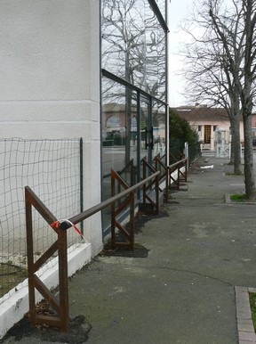 Eh bien vous mettez en place, sur le domaine public, deux barrières métalliques de protection, ainsi qu’une marche pour accéder à votre construction ! Au final, des aménagements ont été réalisés sur le domaine public à votre usage personnel, là où en toute bonne logique, ils auraient dus être effectués sur votre propre terrain.