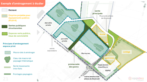 A la différence des réalisations déjà existantes sur cette zone (le lotissement Murmures, le foyer de jeunes travailleurs et l’ESPIC), réalisées dans le cadre du précédent Plan Local d’Urbanisme en vigueur, l’approche considérée pour l’urbanisation du reste de la zone est maintenant globale. Elle intègre aussi les nouveaux objectifs et règles imposés par le nouveau PLUiH en cours de finalisation, prenant notamment en compte les principes de la loi Climat et Résilience de 2021. Garrigue Sud devrait ainsi accueillir au total 480 logements, une école élémentaire, un collège et un gymnase. 3 groupements de promoteurs et architectes seront mis en concurrence pour déposer un projet d’aménagement. Au final, un seul groupement sera retenu pour concevoir l’ensemble de la zone. L’appel à projets inclura un “cahier des attentes citoyennes”, objet de cet atelier de concertation citoyenne.