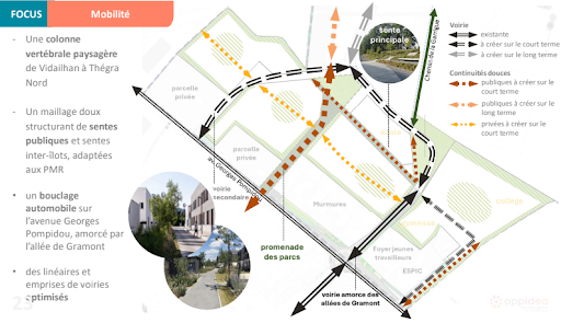 Concernant les mobilités, un point majeur présenté comme un “invariant”, c’est-à-dire indépendant des propositions d’aménagement à venir, a retenu notre attention. En terme de voirie automobile, il est en effet prévu à “long terme” de relier le “bouclage automobile sur l’avenue Georges Pompidou, amorcé par l’allée de Gramont” (flèches noires discontinues sur l’illustration ci-contre) par une “voirie à créer sur le long terme” qui irait rejoindre la route de Lavaur après traversée des zones Garrigue Sud et Nord, puis Thégra Sud et Nord (flèches grises discontinues en haut de l’illustration du haut et tracé gris sur le plan ci-dessous).
